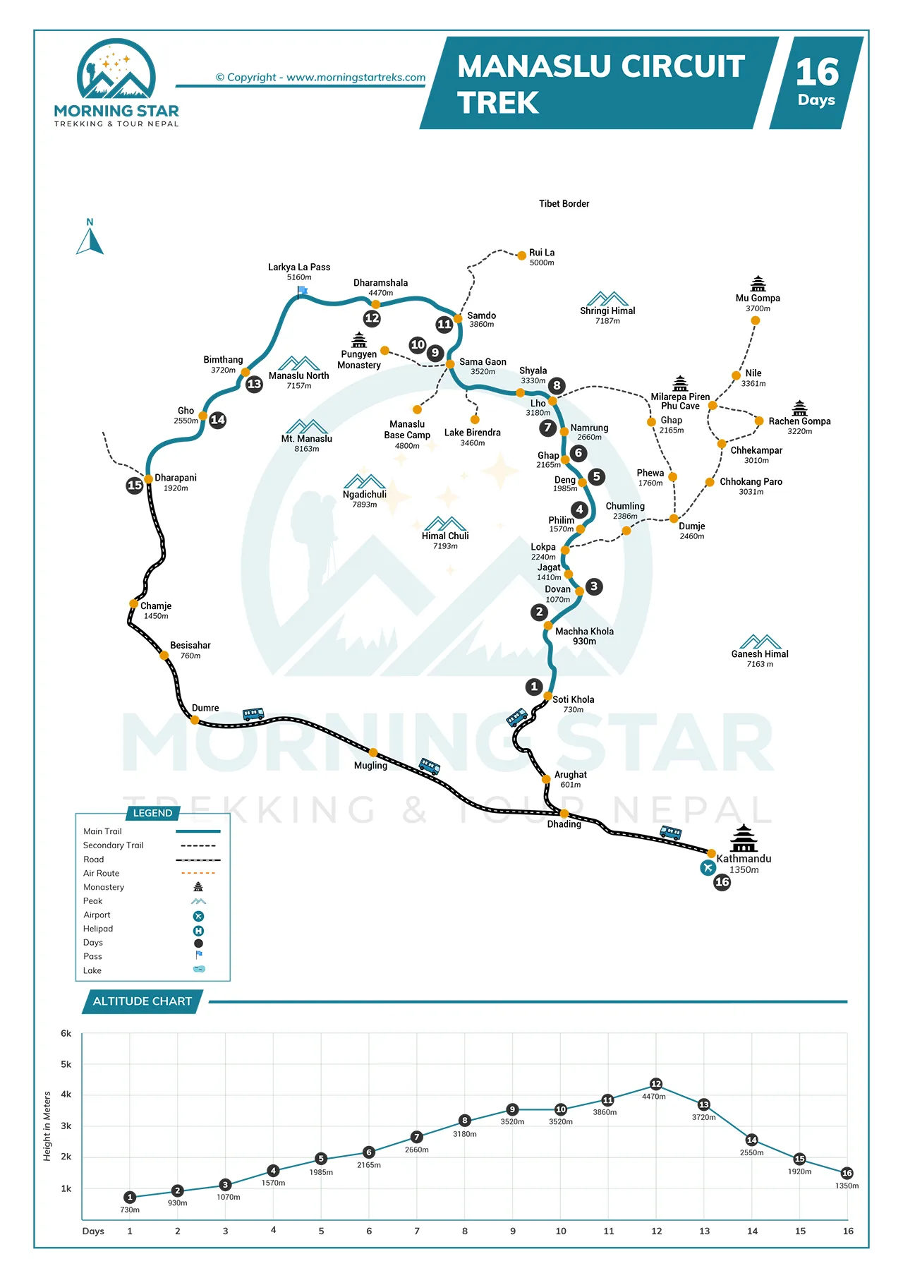 Maksimum Rakım: 5,160 m/16,929 ft. (Larkya La Geçidi)