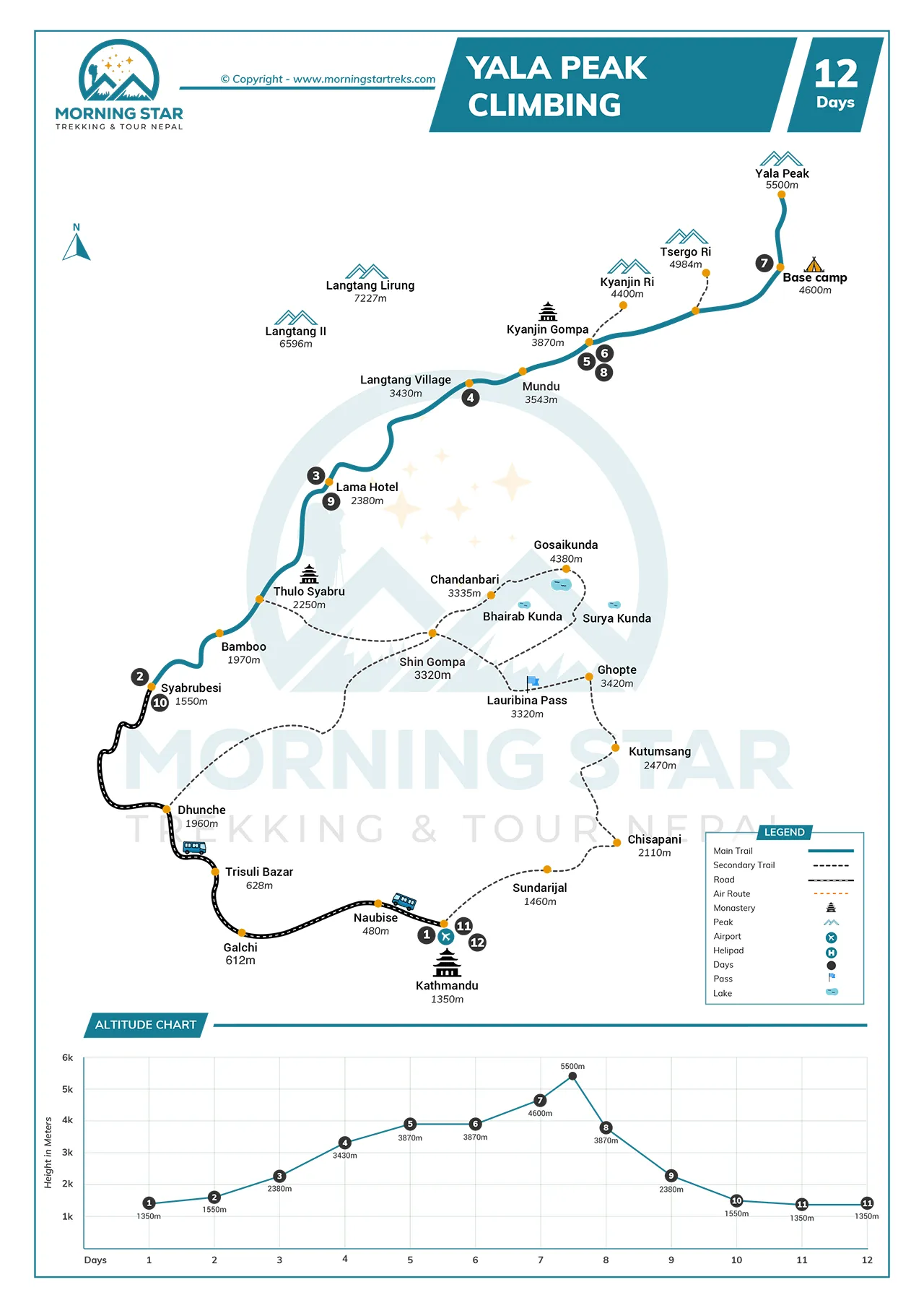 Langtang Vadisi'ni geçerken rakım kademeli olarak yükselmeye devam ediyor. Lama Oteli 2,470 metrede, Langtang Köyü ise 3,430 metrede. Tırmanış öncesi son yerleşim yeri 3,870 metredeki Kyanjin Gompa. Bu noktada, yürüyüşçüler yaklaşık 4800 metrede konumlanacak olan Yala Zirvesi Ana Kampı'na yöneliyor. Zirveye son tırmanış, turun en yüksek noktası olan 5,732 metreye ulaşıyor.