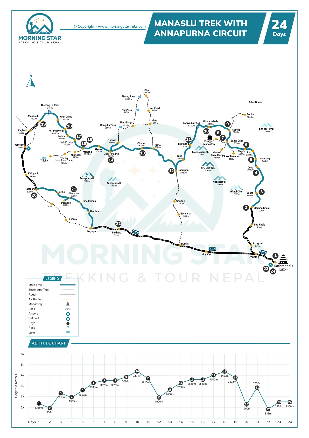 The Manaslu trek with Annapurna Circuit can be categorized as moderate to difficult, primarily due to the many walking days as well as the high-altitude passes, which go above 5,000 meters. Trekkers commonly cover five to nine hours per day, often on steep uphill and downhill walks. The scenery changes continuously; one day it is river-gorge and woodland, the next rocky paths and snowy mountain passes, and this is enough to try endurance and patience.