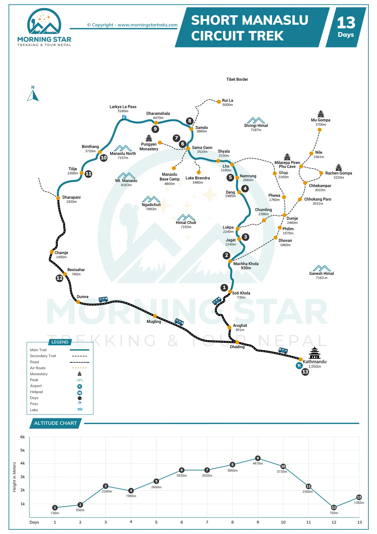 The hike is more than 13-18 days, involves different walks and long walks daily of 5-8 hours, and may involve steep climbs and descents. The traversing of Larkya La Pass (5,160m) is particularly difficult, attributable to the altitude and the land topography.