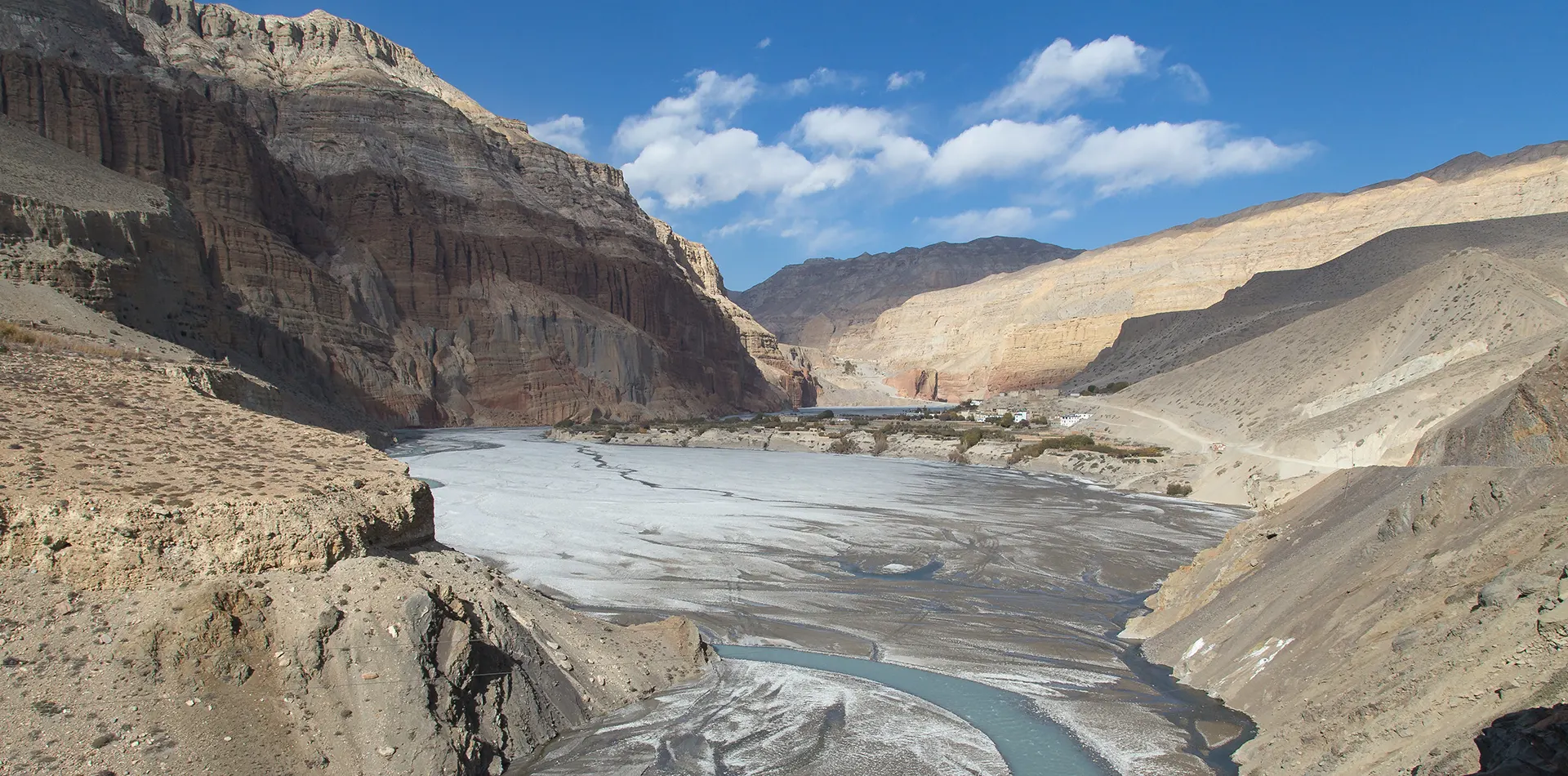 Green hills gradually transform into a dry mountainous landscape as you progress upwards, and it is your first real experience with the unique environment of Mustang. In some places, the road is rough, and the scenery is rewarding the experience.