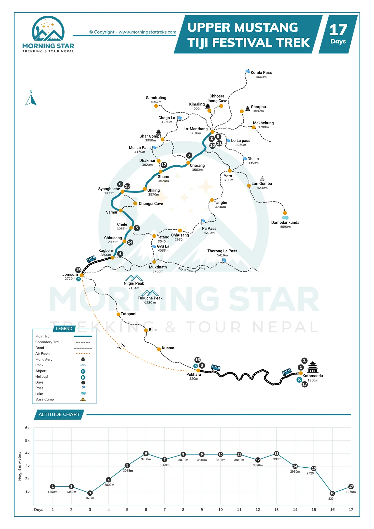The 17-day Upper Mustang Tiji Festival Trek itinerary offers a moderately demanding journey in the Upper Mustang region of Nepal. You will be involved in daily walks of 5 to 7 hours and reach the highest altitude of around 4200 meters.